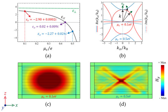 The solid (dashed) lines give the relationship of () with . By using COMSOL MULTI-PHYSICS, the emission pattern of the ellipsoid IFC is shown in Figure 3c (see Appendix A for details of the simulations). In the simulation, a current source is put at the center of the material. However, when the chemical potential is changed to 0.5 eV, the IFC of the graphene/dielectric multilayers will be in the form of a hyperbola, which is marked by the solid blue line in Figure 3b. The change of the IFC will strongly modify the propagation and emission properties of electromagnetic waves. The emission pattern is an open line because the density of states is at a maximum along the hyperbolic asymptote (Figure 3d) [40]. The chemical potential of graphene is modulated by an applied electric field and the topological transition of dispersion is realized with the changed chemical potential [25,26,27,28,29,30,31,32,33,34,35]. This actively controlled topological transition will greatly change the emission pattern of a source in the medium. From the simulated emission patterns, we can find that the emission patterns as shown in Figure 3c,d coincide with the IFCs based on the effective medium theory (Figure 3b). Hence, the actively tunable IFCs in graphene/dielectric multilayers are realized by tuning the chemical potential of graphene layer.
