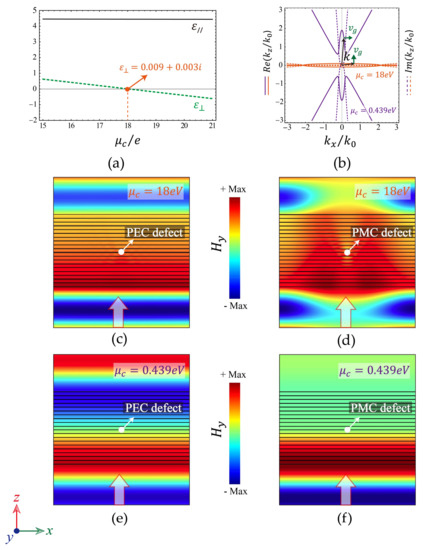 18 eV, the IFC is a very flat elliptic curve along the horizontal direction (marked by orange line in Figure 4b), which can be regarded as one kind of anisotropic ENZ medium. As another kind of anisotropic ENZ medium for 0.439 eV in Figure 3a, the IFC is a very flat elliptic curve along vertical direction (marked by a purple line in Figure 4b). So far, based on a passive system, unusual transportation properties of the light in anisotropic ENZ metamaterials have been demonstrated, including collimation [41], flux manipulation [42], and total transmission (reflection) [43]. Now, with the aid of active control, we study the actively tuned transmissions of two kinds of anisotropic ENZ media based on the graphene/dielectric multilayers. For a type I anisotropic ENZ medium ( 18 eV), when a plane wave is incident on this structure embedded with a tiny PEC defect, the wave can perfectly pass through this defect without any influence, as is shown in Figure 4c. The transmission behavior will change once the PEC defect is replaced by a PMC defect and the incident wave will be scattered by the defect (Figure 4d). Similar to the type I anisotropic ENZ medium, for the type II anisotropic ENZ medium ( 0.439 eV), Figure 4e shows that the incident wave also will not be affected by the PEC defect, as in the case of Figure 4c. However, the transmission will dramatically change for the structure containing a PMC defect. In this case, the incident wave will be completely blocked by the tiny defect (Figure 4f), which is similar to the total reflection effect realized in the double near-zero index material [44]. So, inspired by the demonstration of the topological transition of dispersion, we present the novel transportation behavior that can be controlled in an active manner.