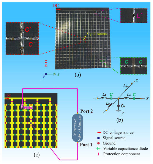 Here, our sample is composed of unit cells with lumped elements that are fabricated on a commercial printed circuit board, F4B, with a relative permittivity of and thickness of 1.6 mm. The width of the micro-strip lines is 2 mm. The unit lengths of TL in the x and z direction are 12 mm. The structural factor of the TL is defined as , where and are the characteristic impedance and the effective wave impedance of the normal TL, respectively. When , the structural factor . Then, we load elements into the normal TL to realize the tunable metamaterials. Considering the transverse electric (TE) wave (, , ), According to the quasi-static TE polarized solution and Ampere’s law, by loading the variable capacitance diode , the effective permittivity and permeability of 2D TLs in the long-wavelength limit can be written as [23,45]: