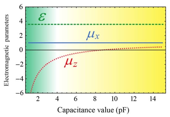 where is permeability of vacuum. and are the per-unit-length inductance and capacitance of TL segment, respectively. The effective permittivity is isotropic in our structure. For the varactors, one can change the external voltage to tune the capacitance value of . The reference relationship between bias voltage and the diode capacitance provided by the product manual is indicated by the blue dotted line in Figure 6. From Equation (7), by continuously changing the value of , the sign and value of can be actively controlled at a fixed frequency. Through the modulation of capacitance, we can manipulate the sign of from negative to positive while the signs of and remain positive, as shown in Figure 6.
