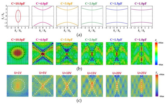 We further use the computer simulation technology (CST) microwave studio software to perform the simulation. A linearly polarized source is loaded near the center of the sample, as is marked by the blue point in Figure 5. In Figure 7b, we simulated patterns of sample at 0.8 GHz by varying the value of . The emission patterns for different values of coincide well with the IFCs in Figure 7a. For example, for = 10 pF, the IFC is a closed ellipsoid and the source can propagate in all in-plane directions. However, for = 4.0 pF, the IFC is an open hyperbolic curve and the source can only propagate in some directions. In particular, for = 1.0 pF, the IFC is very flat. The source is collimated and can only propagate in the vertical direction.