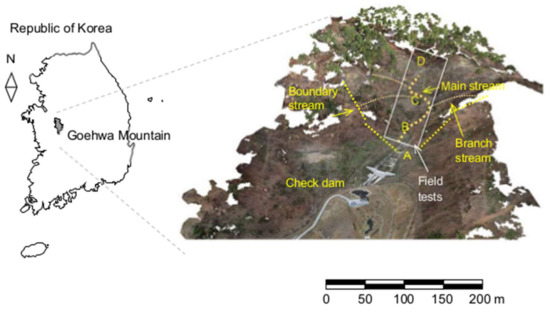 The selected testing site experienced debris flow a few years ago and is still susceptible to additional debris flow because of several geological characteristics of the site, including steep slope angle (over 32°) and saturated soil condition on slope. According to the geological map issued by the Korea Institute of Geology, Analysis, Mining (KIGAM), the testing area mainly consists of gneissose granite terrane. The testing site belongs to Mt. Geohwa, South Korea, where the altitude and area are approximately 200 m and 1.2 km2, respectively, and the latitude and longitude of the top of the mountain are N 36°29′15.7313′′ and E 127°18′40.5986′′. A drone aerial survey was performed to obtain a topographic map and digital elevation model. Figure 1 shows the topographic map: the area consists of one main stream and several branch streams. The vertical length and area of the main stream are approximately 206 m and 14,675 m2, respectively. Figure 1 also indicates the presence of the debris barrier and check dam at the site to prevent additional debris flow (N 36°29′04.3147′′, E 127°18′44.7017′′). The main stream was divided at four points, selected by considering slope characteristics: point A (N 36°29′10.8530′′, E 127°18′44.1891′′), point B (N 36°29′12.045′′, E 127°18′39.5912′′), point C (N 36°29′14.8329′′, E 127°18′30.7079′′), and point D (N 36°29′18.2046′′, E 127°18′23.6158′′). Point A, which is located at the bottom of the main stream, shows various fallen trees and weeds undergoing decay and rot, suggesting that considerable time has passed since the occurrence of the last debris flow. The slope of point A was measured to be approximately 10°, which is low compared to the slopes at points B and C. Thus, point A is covered with various flowed materials from the streams above due to debris flow. Point B shows a dramatically steeper slope of approximately 27° and the area mainly consists of sedimentary basin. Point C has the largest rapid slope (~32°) and width (maximum 105 m) among the selected points. Note that point C is located at a large catchment basin. Finally, point D indicates the initial zone where the debris flow occurred as ascertained by the presence of upright trees and a stable subsurface without collapsed conditions.