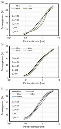A hand auger with an outer diameter of 20 cm was used to excavate the subsurface and a soil sampler was used to gather the specimen at the wall of a borehole. The length of the hand auger was limited to 2 m due to a shortage of engine output, and thus the maximum depth of extracted soil in this study was 2 m. Even though the hand auger can potentially excavate soil down to a maximum of 2 m, the actual excavated depth was reduced due to the presence of gravel and weathered rock. Therefore, the actual maximum extracted depths were 1, 1, and 2 m at locations near points A, B, and C, respectively. The results from the excavations at points A and B show various deposited materials, including gravel and boulder (Figure 2). At point C near the initial zone, a larger extraction depth (~2 m) could be achieved due to the presence of a relatively deep soil layer (Figure 2). Soil samples were collected at 4–5 different depths: 10, 40, 60, and 100 cm for points A and B; and 10, 40, 90, 140, and 200 cm for point C. Sieve tests were performed using the extracted specimens according to [15].