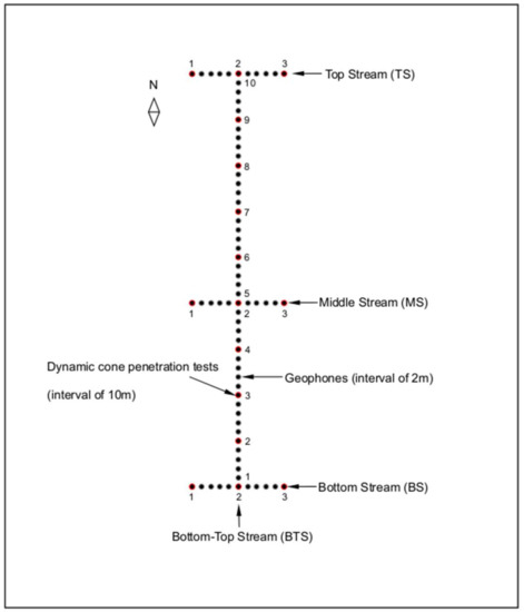 A seismic survey has the advantage of assessing a whole area without altering the fabric state; thus, the measured values can greatly reflect the state and behavior of soils. A seismic wave propagates in solid media by travelling through particle connections, and thus the wave velocity increases with an increase in the particle contact area (or applied confining stress or soil depth). The seismic refraction method was applied in this study to obtain a profile of compressional (or primary) wave velocity. Four transects were determined with consideration for spatial variability in the geological characterization of each stream. Figure 3 shows schematic drawings of the seismic transections. The bottom-top stream (BTS) line reflects the main stream from south to north (from points A to D in Figure 1), whereas the bottom stream (BS), middle stream (MS), and top stream (TS) lines are horizontally set to reflect bottom, middle, and top valleys, respectively. The center of the MS line is located between points B and C in Figure 1. The lengths of the transection lines are 90, 20, 20, and 20 m for BTS, BS, MS, and TS, respectively. A geophone was installed as a sensor for gathering seismic waves every 2 m; therefore, the installed geophone numbers in the profiles of BTS, BS, MS and TS are 45, 10, 10, and 10, respectively. A sledgehammer was used to generate vibrations, and the impactions were performed at start, middle, and end positions to enhance signal-to-noise ratios. Impactions were performed five times in the same position for each test to minimize random noise.