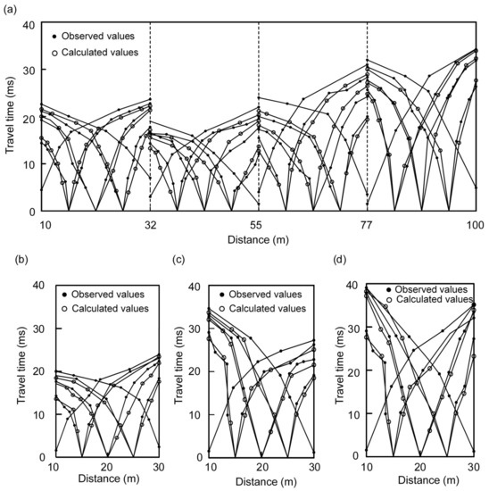 Travel time-distance curves through seismic survey: (a) BTS; (b) BS; (c) MS; and (d) TS. Note 10, 20, 30, and 100 m distances indicate points 1, 2, 3, and 10, respectively, in Figure 3.