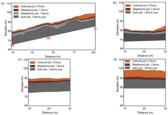 The first arrival time of the measured seismic wave signals was determined through PickWin software (OYO corporation, Tokyo, Japan), and the time-distance curve was obtained by using the SeisImager-Poltrefa program (OYO corporation, Tokyo, Japan). An interactive process was performed to increase resolution when carrying out the inversion process. Two groups, which are based on the picked first-arrival times and the results analyzed by the simultaneous iterative method, are plotted on a travel-time curve in Figure 4. Figure 4 shows that the two groups are nearly identical, reflecting that the quality of the measured data is high. The distribution of seismic wave velocity is plotted in Figure 5, and the soil layers are divided into various different layers according to the reference P-wave velocities suggested by [20]: 0–0.7 km/s (landfill and alluvial soil), 0.7–1.2 km/s(weathered soil), 1.2–1.9 km/s (weathered rock), and over 1.9 km/s (soft rock). The BTS, BS, MS, and TS lines were found to comprise four, four, three, and three layers, respectively based on Reynolds (2003). Note that 0.7 km/s of primary wave velocity is an accepted criterion in South Korea for distinguishing soil layers from other geomaterials [21,22].