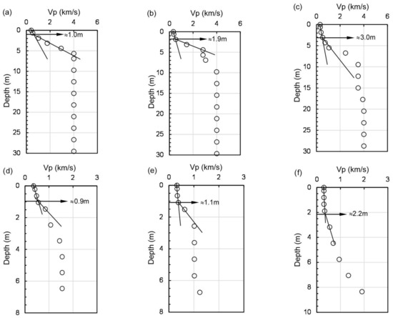The seismic wave velocity slightly increases with depth even in one layer because of the increase in effective stress (Equation (3)), which is the function of mass density and depth. However, the wave velocity changes rapidly at layer boundaries due to the change in material type, mass density, particle size, and others. Hence, the relation between seismic wave velocity and depth can produce different slopes along the depth. Figure 7 shows the seismic wave velocity with the depth at which the geophones are installed. It can be observed in Figure 7 that there are four different lines “a”, “b”, “c”, and “d”: Line “a” indicates the initial slope between wave velocity and depth; thus, it is related to the first soil layer; Line “b” indicates the second slope between wave velocity and depth; thus, it is related to the second layer. Therefore, the intersection point between lines “a” and “b” may correspond to the thickness of the first soil layer, which is point “e”. Figure 8 shows the calculated soil depths based on the suggested graphical bilinear method at the selected testing sites. It is shown in Figure 8 that various soil depths can be estimated by the proposed method. The detailed soil depths based on the suggested graphical bilinear method are summarized in Table 1.