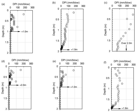 A dynamic cone penetrometer (DCP) test was selected as an invasive method to verify the soil depths estimated by seismic waves. Note that the DCP method can readily detect the thickness of soil layer because the continuous penetration of DCP enables the easy recognition of the presence of different layers [16]: the penetration depth through stiff material is relatively small. The DCP technique has been widely applied to investigate soil properties in geotechnical engineering, especially for railways and roads [16,17,18]. The test records the penetration depth of DCP when a hammer drops from a fixed height according to [19]. The hammer weight and drop height were fixed to 78.8 N and 575 mm, respectively. The tip diameter of the DCP was 20 mm with an apex angle of 60°, and driving energy was 45 J. The penetration depth was converted into dynamic penetration index (DPI), which represents (mm/blow) as follows.