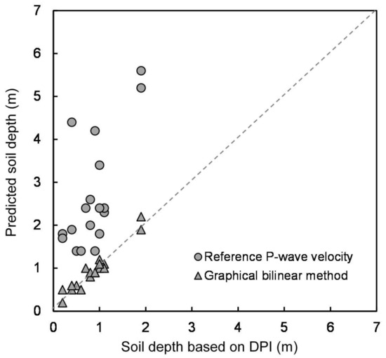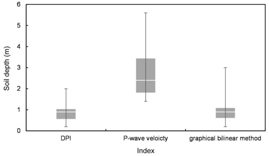 Figure 10 shows the comparison of soil depths predicted by the reference P-wave velocity (0.7 km/s) and the graphical bilinear method with the measured depths using dynamic cone penetration test. Note that the depth based on the results of the dynamic cone penetration test (DPI values) has relatively high reliability because the data is gathered through direct penetration of the probe into soil; therefore, the soil depth measured by DPI can be regarded as the real soil depth. The soil depth predicted based on the reference P-wave velocity shows high variation and high soil depth compared with those based on DPI values. In contrast, the soil depth based on the graphical bilinear method shows small variation and the estimated values are comparable with the measured values by dynamic cone test, reflecting the enhanced reliability of the estimated soil depth by using the suggested method. Furthermore, the deduced soil depths based on DPI, P-wave velocity and graphical bilinear method are compared through box and whisker plot as shown in Figure 11. The median values of DPI and graphical bilinear method show 0.35 m and 0.3 m, and however the median soil depth based on P-wave velocity is highly deduced to 0.5 m. The first and third quartiles of DPI and graphical bilinear method show also similar ranges of 0.15–0.55 m and 0.2–0.6 m, respectively and it shows the difference is just 0.5 m. However, the soil depth estimated by existing method shows unreasonable ranges of 1.05–1.8 m. The ranges of minimum and maximum values based on DPI (0.2–2 m) and suggested method (0.2–3 m) are also demonstrated to similar trends while those deduced by P-wave velocity exhibited huge variations (1.4–5.6 m). And thus, the Figure 11 shows that the suggested method can provide the reliable soil depth under ≈3 m with consideration of 2 m intervals of geophone.