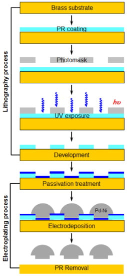 The process for fabricating the micro-porous Pd–Ni membrane filter consists of two steps: (1) the lithography process; and (2) the electroplating process, as shown in Figure 2. The lithography process was used to generate standard column-like patterns, an important process that determines the position of the filter pore and the size of the whole filter. This was followed by the electroplating process, which involved an electrochemical reaction to form a thick palladium–nickel alloy layer above the brass substrate. The required fine-scale specification was achieved using a similar technique that employs piezoelectric inkjet print heads.