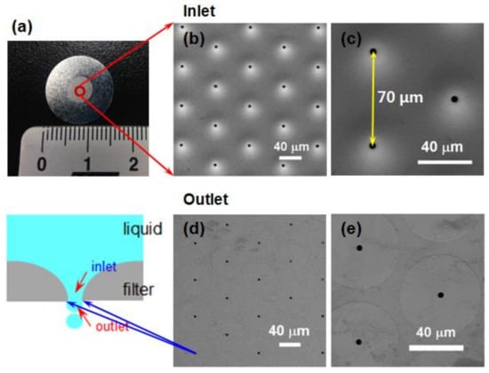 Figure 3. Optical and field-emission scanning electron microscopy (FESEM) images of the micro-porous membrane filter. (a) Schematic diagram of the pathway of an aerosol droplet. FESEM images in the (b,c) inlet and (d,e) outlet directions.