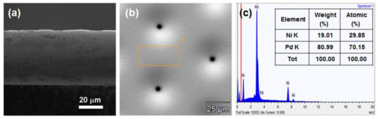 The composition of the Pd–Ni alloy was evaluated using EDS analyses to examine the composition of the fabricated Pd–Ni alloy filter. Figure 4b shows the location where the EDS measurement in the inlet pore direction of the Pd–Ni membrane filter was conducted. The EDS analysis of the Pd–Ni membrane filter revealed the existence of Pd and Ni elements, further confirming the formation of the Pd–Ni alloy (Figure 4c). The Pd and Ni element contents were 80.99 and 19.01 wt %, respectively.
