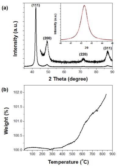 Figure 5. Analysis of micro-porous membrane filter: (a) X-ray powder diffraction (XRD) and (b) thermal gravimetric analysis (TGA). The inset is fitting curve of the (111) main peak.