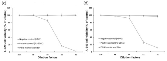 The extraction method also presented no significant cytotoxicity of the micro-porous membrane filter, with no decreased cell viabilities for both the L-929 and A-549 cells, as shown in Figure 6c,d.
