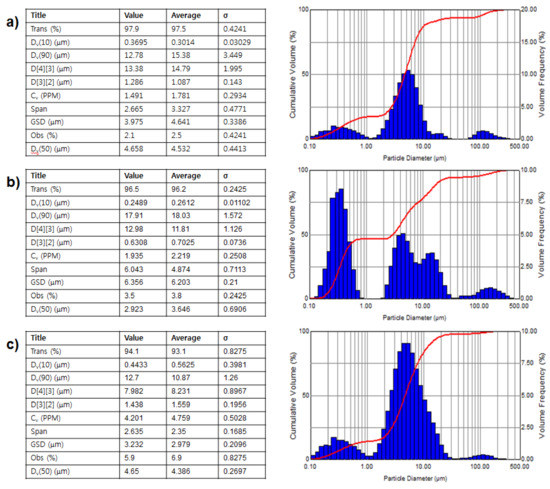 Figure 8. Distribution of the size of droplets of (a) deionized (DI) water; (b) amphetamine; and (c) levofloxacin drug solutions using the developed micro-porous mesh nebulizer.