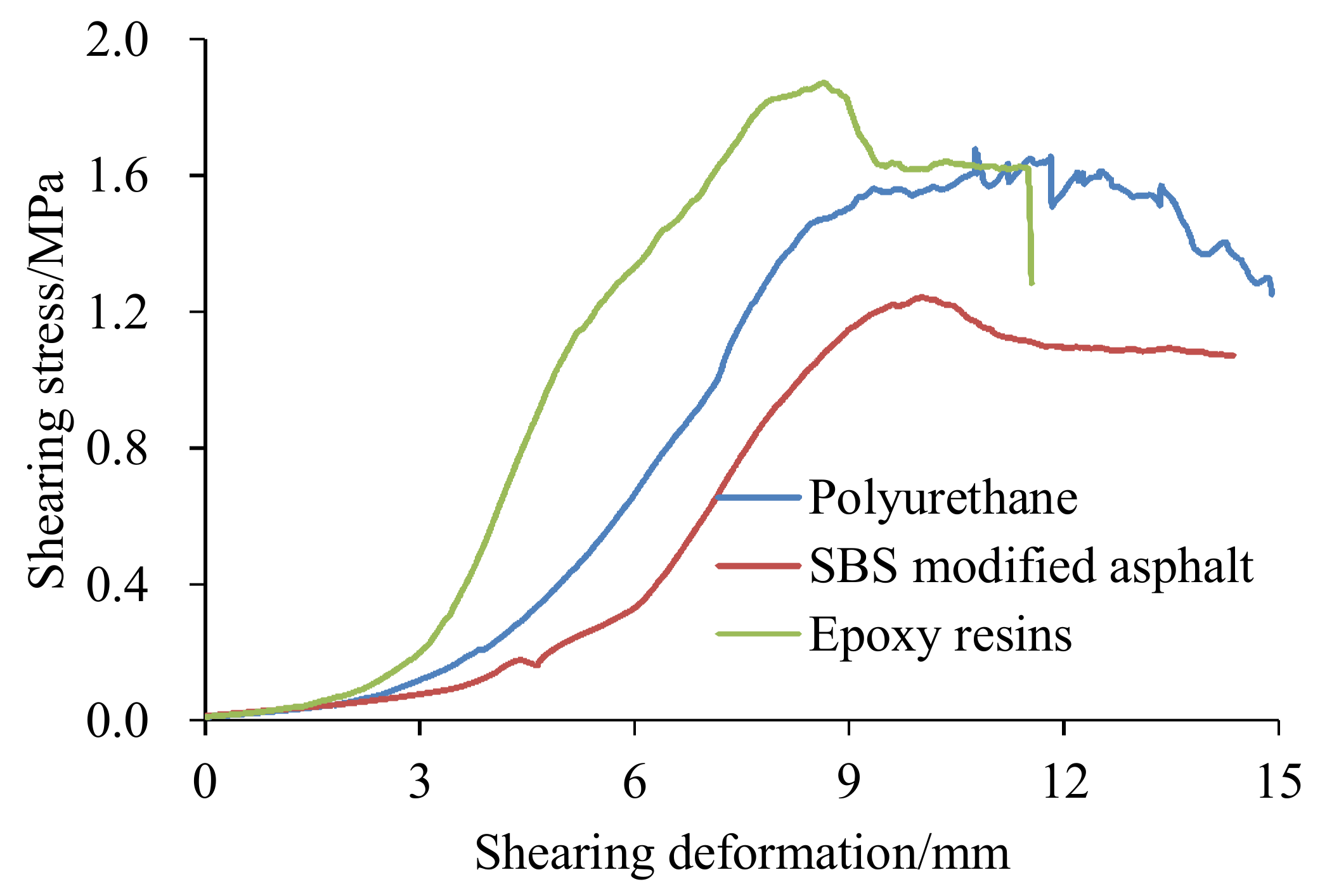 - The interface shear strength increases as the thickness of adhesive layer increases, although the trends vary depending on the material. In general, the greatest interface shear strength was achieved by using epoxy resin followed by polyurethane and then SBS modified asphalt at 25 °C as the adhesive layer thickness is the same.