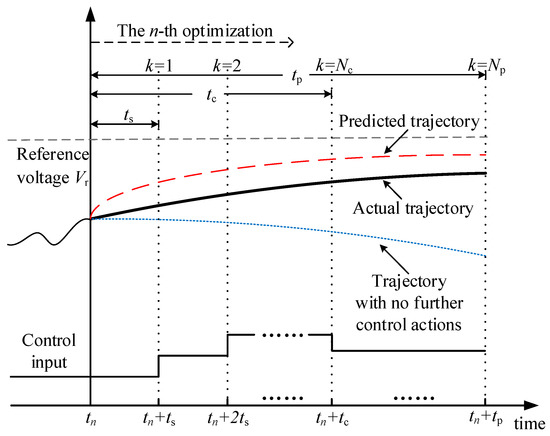 - Prediction horizon tp. The system response caused by the control actions are predicted within the prediction horizon, thus the length of the prediction horizon should be greater or equal to the length of the control horizon. When the controlled voltages are gradually stabilized to the steady state values, the necessity to consider changes happening beyond the control horizon is reduced from a computational viewpoint. Therefore, at the beginning of the MPC implementation, the length of the prediction horizon is set longer than the length of control horizon. As the receding horizon optimization progressed, the length of the prediction horizon gradually approaches the length of the control horizon, which could also save unnecessary computation time