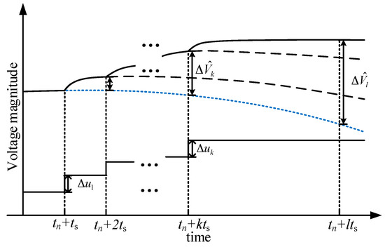 The voltage prediction based on trajectory sensitivity analysis is graphically illustrated in Figure 2. According to the proportion and superposition characteristics of linear systems, the predicted voltage at a sampling point k is composed of two parts: the voltage without control during the prediction horizon and the voltage variation cause by the control actions applied at each sampling points. At the initial control time, is solved based on trapezoidal numerical integration of (1) and (2). is solved based on the Jacobian obtained during the numerical integration process. The vector consist of all the predicted voltages at each sampling point can be expressed as: