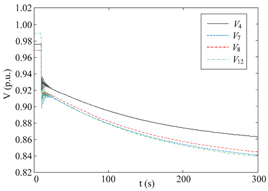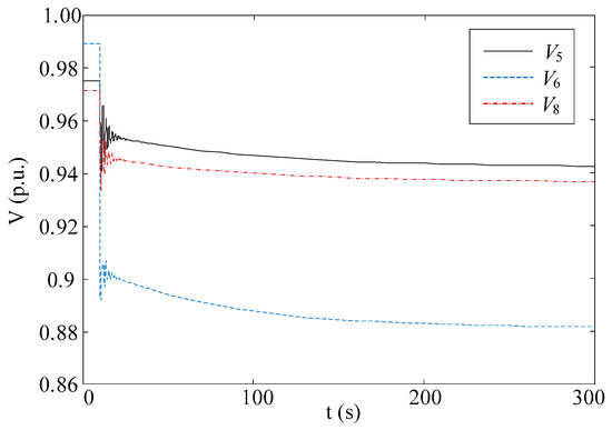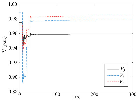 Line between bus 4 and bus 6 are tripped at t = 10 s. The evolution of voltages at load bus 5, 6 and 8 are illustrated in Figure 7. Due to the loss of the transmission system, the voltage magnitudes drops below the lower bound if no control actions are applied.