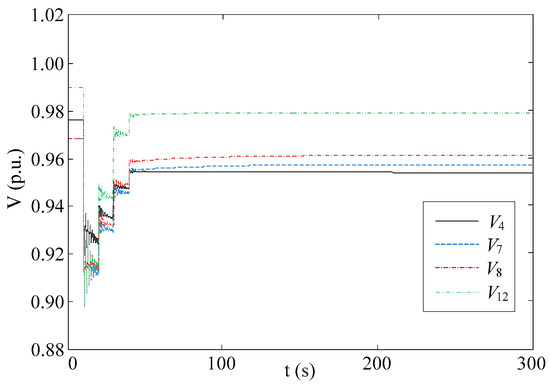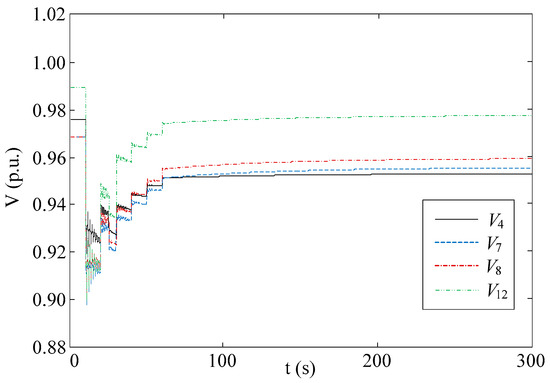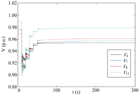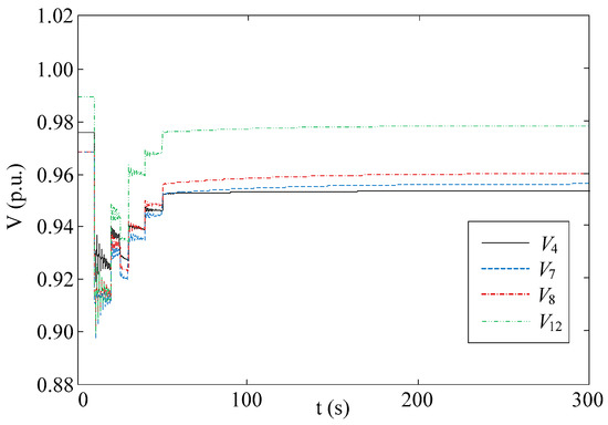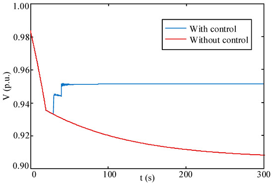 The control performance of the proposed method is compared with the ordinary MPC-based method using constant horizon parameters (tc = 30 s, tp = 60 s). The fault scenario, system parameter and other controller parameter settings are the same as case B. The control result is shown in Figure 16. All the voltages meet the constraint requirements after 4 optimizations are implemented. The performance comparison is listed in Table 5. An index of average voltage deviation of all the load buses is introduced as: