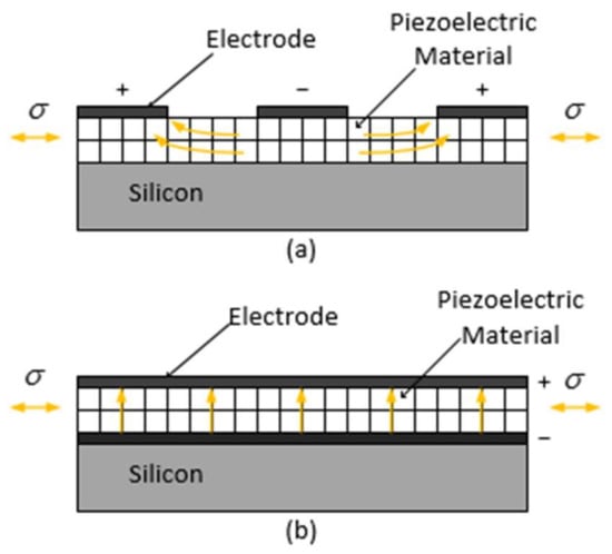 - Chidambaram, N.; Mazzalai, A.; Balma, D.; Muralt, P. Comparison of lead zirconate titanate thin films for microelectromechanical energy harvester with interdigitated and parallel plate electrodes. IEEE Trans. Ultrason. Ferroelectr. Freq. Control 2013, 60, 1564. [Google Scholar] [CrossRef] [PubMed]