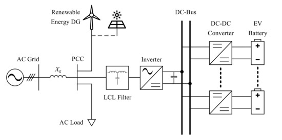 As grid load continues to increase, the high cost of renewing the infrastructure such as distribution lines and transformers has become a serious constraint [26,27]. These constraints have given rise to the introduction of generation in the form of DGs in proximity to the load [28], which reduces the stress on the distribution transformers and lines. Appropriately-placed and -sized DGs reduce losses and also tend to satisfy the power and voltage limitations [29]. Furthermore, solar or wind-based DGs are an eco-friendly way to generate power, which helps to reduce the greenhouse gases emission [30]. Solar and wind power are well suited to be integrated as DGs owing to the ease of integration at the required location because of their small size and expandable nature. Environmental policy requirements have also encouraged the introduction of renewables. At the same time, EVs have been introduced in the transportation sector to shift the trend away from conventional vehicles. Figure 1 depicts a schematic of a renewable energy DG and EV integration at the PCC, adjacent to the load being fed from the AC grid and the DG. EVs are connected parallel to each other at the DC-bus of the charger.