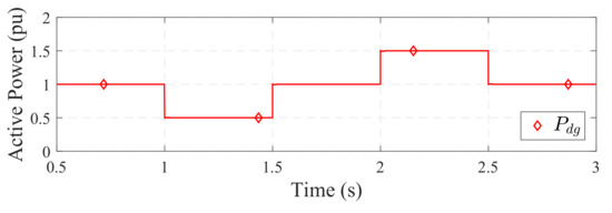 A positive and negative variation of 50% from the mean output power value is considered for the DG, which is based on the fluctuating characteristics of photovoltaics and wind turbines [3,33,34,35]. Figure 2 shows the DG power output with deviations from the 1 pu mean value.