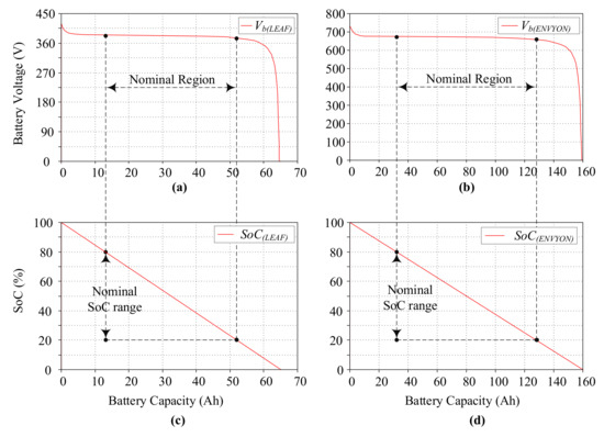 Based on these parameters, and using Equation (5), the discharge voltage characteristics and SoC profiles of both EVs have been established as shown in Figure 3. The discharge curves have been measured at 1C, which is the discharge current that depletes the entire battery capacity in one hour from an SoC of 100% to 0%.