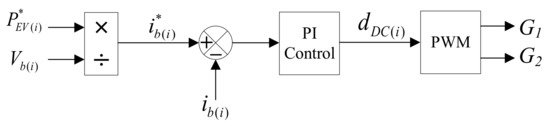 where is the reference battery current, is the active power reference of the i-th EV and and are the proportional and integral gains of the PI controller. When , the signal to both switches and becomes zero, and the switches are in halt mode. The control strategy is shown in Figure 5.