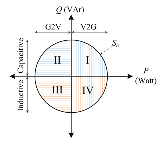 Conventional chargers perform only one-way power transfer from the grid to the EV and operate at a close to unity power factor, whereas a bidirectional charger offers the capability to discharge the battery energy for support. However, a four-quadrant charger enhances the functionality of a bidirectional charger by adding the ability to provide or absorb reactive power. It can operate at any point on the circle, where and is the kVA rating of the charger. Such chargers lie in the category of off-board fast-charging stations where the weight and size is not a significant constraint. Four-quadrant operation of a converter is demonstrated in Figure 6.
