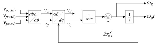 The inverter controller receives the references from the EMS. The control is in the frame with a conventional current loop. Synchronization of the inverter with the grid is achieved through the phase locked loop (PLL), which intakes the three-phase voltage signals from the PCC bus . The PLL configuration is shown in Figure 8. Various output signals from the PLL are utilized in the current control.