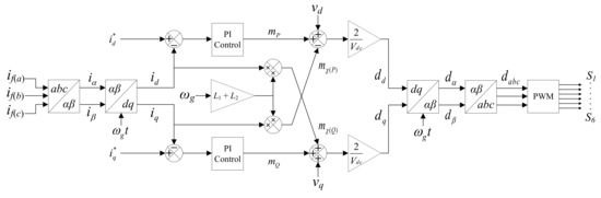 where and are the direct and quadrature voltages from PLL. The instantaneous currents and are generated from the three-phase LCL filter current . The control process is shown in Figure 9.