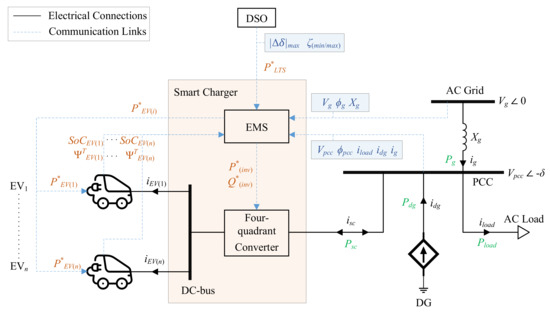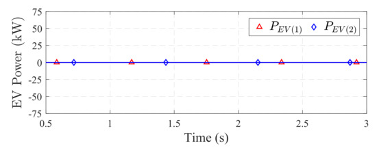 Consider the power system shown in Figure 10. The grid is transferring power = 100 kW to the PCC. A constant power load = 250 kW with the unity power factor is connected to the PCC. A DG supplying = 150 kW to the load is located in close vicinity to the PCC. When plugged in, the EVs connected to the smart charger are idle, charging or discharging based on the rate governed by the DSO. The EV power during such ongoing schemes is represented by , and this scenario is given by the following equation: