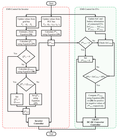 During renewables’ power variance, the EMS calculates the active power reference for the smart charger. The low output from the DG corresponds to an increased power transfer from the grid to the PCC, and the EMS calls for V2G operation. In contrast, during surplus generation by the DG, the power transfer from the grid decreases, and the EVs are charged to absorb the surplus power, while the G2V improves the load factor. The total amount of active power required or to be consumed by EVs is calculated as follows: