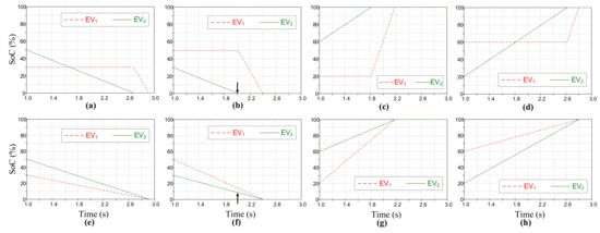 Considering the reference method (RM) for power allocation [24], since the battery capacity of is greater than (Table 1), should be fully charged or discharged first, and afterward, is engaged. This practice is shown in Figure 12a–d. On the contrary, the proposed scheme employs both EVs simultaneously for discharging and charging (Figure 12e–h). It considers the battery size, as well as the current SoC and calculates the power references for each EV proportionate to the instantaneous energy stored on-board the EV.