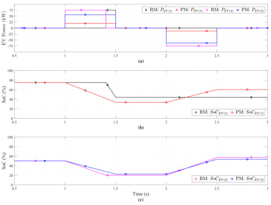 (a) Discharging and charging power of the two EVs under the reference method (RM) and the proposed method (PM). (b) SoC comparison RM vs. PM. (c) SoC comparison RM vs. PM.