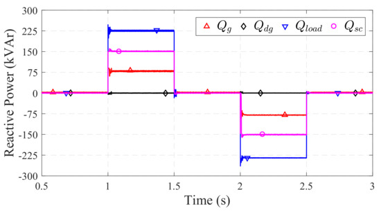 The EMS also drives the reactive power support of the smart charger under voltage sag or swell during reactive load onset. As shown in Figure 16, the period s to 1.5 s is represented by a large consumption of 216 kVAr, while from s to 2.5 s, there is a significant production of reactive power at the load end. These events are accommodated by the smart charger to lessen the stress on the grid. The EMS calculates reactive power to be provided or consumed to compensate the sag and swell, respectively.