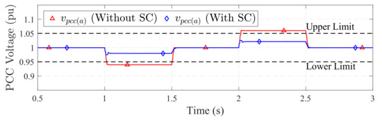 The load consuming reactive power brings about a sag at the PCC voltage, which is indicated in Figure 17 (without SC). The voltage sags below the lower limit of 0.95 pu defined for normal operation [48]. On the contrary, the reactive power produced at the load end is absorbed by the grid, thus producing a swell, and the PCC voltage surpasses the upper limit of 1.05 pu. With smart charger employment and zero active power requirements, the full capacity of the smart charger is utilized for reactive support to bring the voltage within limits, as shown in Figure 17 (with SC).