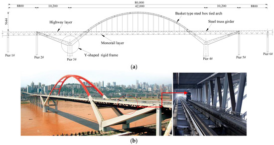 The layout of the Caiyuanba Yangtze Bridge (unit: cm): (a) elevation view; (b) overview.