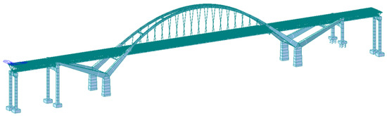 Figure 2 shows the finite element model of the bridge subsystem. The arch ribs are divided into 23 segments along the axis of the bridge. The transverse bracing of the arch rib and arch rib are modeled by three-dimensional beam elements. The suspenders and tied bars are modeled using three-dimensional truss elements. The effect of pre-tension on a bar member is simulated by specifying an initial tensile strain in the member. The steel truss girder, Y-shaped rigid frame, and piers are modeled using 3D beam elements. Each of the beam elements has two nodes, and each node has six DOFs. In total, the bridge model has 3257 nodes and 6515 elements, which include 136 truss elements and 6319 beam elements. In light of the boundary conditions, the steel truss girder is supported using eight basin type rubber bearings placed on the bridge piers, which are fixed at the bottom. A linking bar support is arranged at the pier top of the transition pier. In order to control the displacement of steel truss girder under the action of the braking force, wind force, and earthquake force, the bottom chord bar of the steel truss girder is connected with the beam of the abutment pier. The mechanical properties of the materials are listed in Table 1.