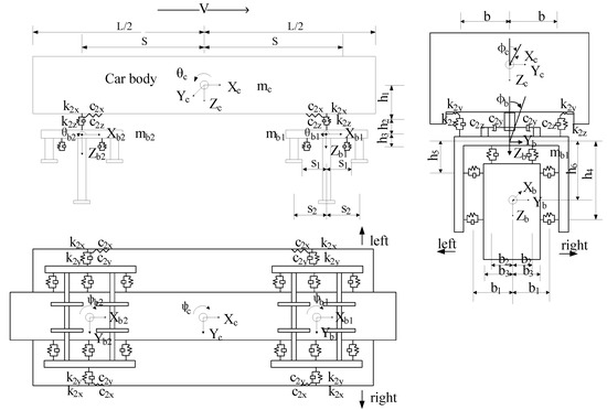 The DOFs of the car body can be expressed as uc = {yc zc φc ψc θc}T, and the DOFs of the bogie can be expressed as ubj = {ybj zbj φbj ψbj θbj}T, where j = 1 and j = 2 represent the front and the rear bogies, respectively. The governing equations of the train are derived using an energy method based on the Lagrange equation, as shown in Equation (9) [28].