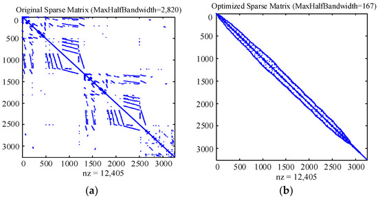 With the AD algorithm, the bandwidth of the mass, stiffness, and damping matrices of the bridge was reduced from 2820 to 167, as shown in Figure 5.