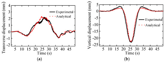 The time–history curves of the displacements of the bridge at the mid-span with one train running through the bridge at a speed of 60 km/h: (a) the vertical direction; (b) the transverse direction.