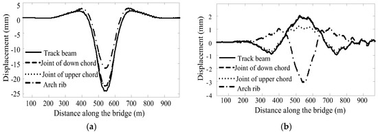 The displacements of the bridge at the mid-span: (a) the vertical direction; (b) the transverse direction.