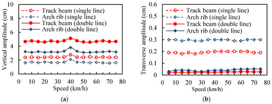The peak values of the displacements in Figure 7a,b represent the vibration amplitudes, which are plotted in Figure 8a,b. Both the vertical and transverse amplitudes do not change significantly with the train’s speed when the speed is no more than 30 km/h. When the speed is increased to 40 km/h, the amplitude of the vertical displacement is abruptly increased and a peak appears in Figure 8a. The peak is likely due to the resonance between the bridge and the train moving on it at the speed of 40 km/h. However, the transverse amplitude is insensitive to the change of the train speed. When the loading case is changed from a single line to a double line, the vertical amplitude of the bridge is increased while the transverse amplitude of the bridge is reduced. The transverse amplitude of the bridge approaches zero as the two trains run on the double line, while the transverse amplitude of the bridge increases obviously as one train runs on a single line. The transverse vibration of the bridge is mainly caused by the eccentric train loading.
