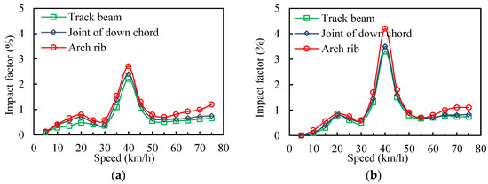 The impact factor is defined as the ratio of the increased vertical deflection induced by moving trains to the static deflection of the bridge. Figure 9 shows the simulation results of the impact factor in the single line and double line loadings, respectively. The impact factor reaches the maximum values when the vehicle speed is 40 km/h in both the single line and double line loading cases due to resonance induced by the moving trains. Overall, a slightly greater impact factor is achieved in the double line loading case. The largest impact factor is 4.2% in the double line case and 2.7% in the single line case, both achieved by the arch rib. The reason could be that the stiffness of the arch is larger than that of the beam due to the “arch effect” [41,42] and that the structure with the bigger stiffness will bear the greater impact force. The results from the two loading cases follow a similar trend and resonance occurs at the same speed in the two loading cases, indicating that whether single line or double line, the loading applied does not significantly affect the impact factor of the bridge.