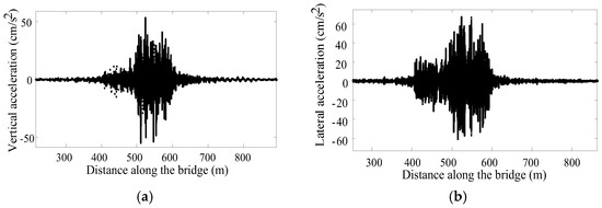 Figure 10 shows the time-history curves of the mid-span acceleration of the bridge with a single line train loading at the speed of 60 km/h. The maximum lateral and vertical accelerations occur when the train travels to the mid-span. The peak value of the transverse acceleration of the bridge is slightly larger than the peak value of the vertical acceleration.