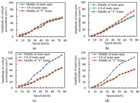 The amplitude of the accelerations of the bridge: (a) and (b) single line; (c) and (d) double line.