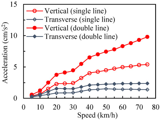 Figure 12 shows the calculated results of the acceleration of the arch rib at the mid-span. It can be seen that the vertical acceleration is greater than the transverse acceleration and the acceleration of the arch rib with two trains running on the double line is greater than that with one train running on a single line. The maximum acceleration is 9.8 cm/s2, which is much less than 140 cm/s2, which is the limit of the transverse acceleration specified in the code for rating existing railway bridges [43]. The comparison of Figure 11 and Figure 12 shows that the acceleration of the track beam is much greater than that of the arch rib. The reason could be that the track beam is subjected to direct loading and the vehicle is coupled with the track beam, while the arch rib is subjected to indirect loading.