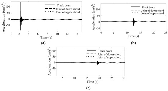 The time–history curves of the longitudinal accelerations shown in Figure 14 indicate that when the temporary impact occurs, the longitudinal accelerations of each calculated position varies greatly. As the distance from the braking position increases, the longitudinal acceleration of the steel truss girder becomes smaller. After the temporary impact, the amplitude and phase of the longitudinal acceleration of each position are consistent.